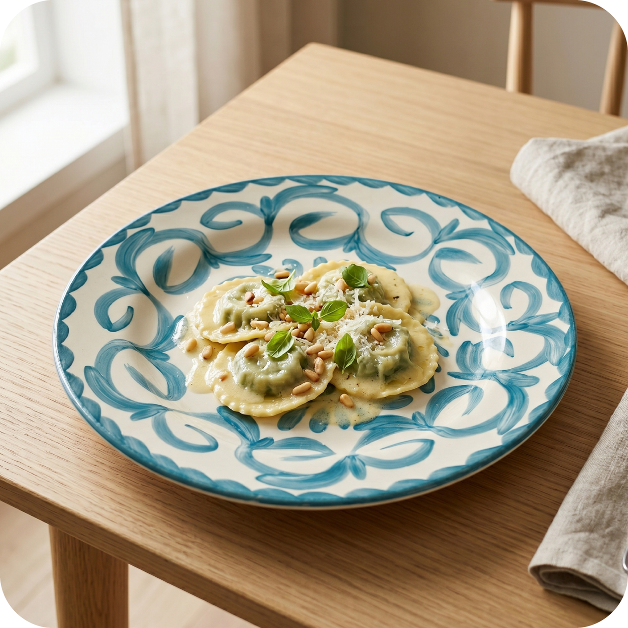 やわらかなオフホワイトが料理を引き立てる、クラシックな佇まい。 -